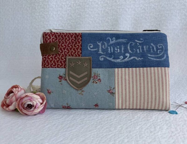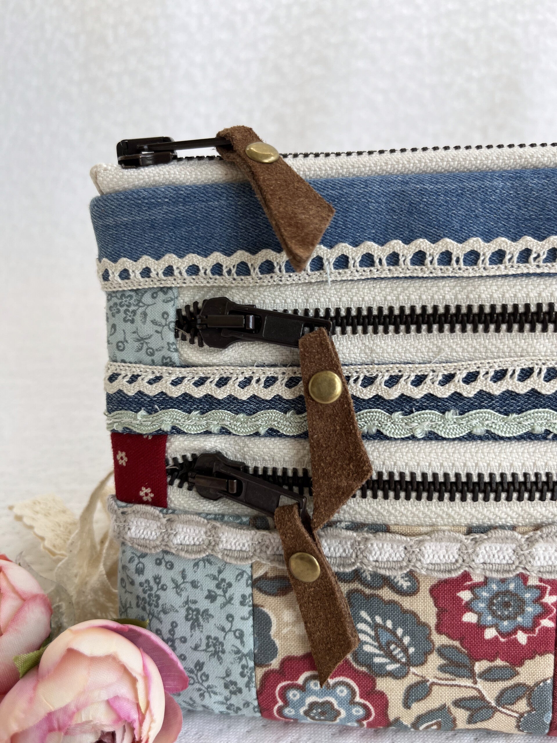 It’s made from cotton fabric and denim in a patchwork design and finished with lace details and suede zipper pulls.
