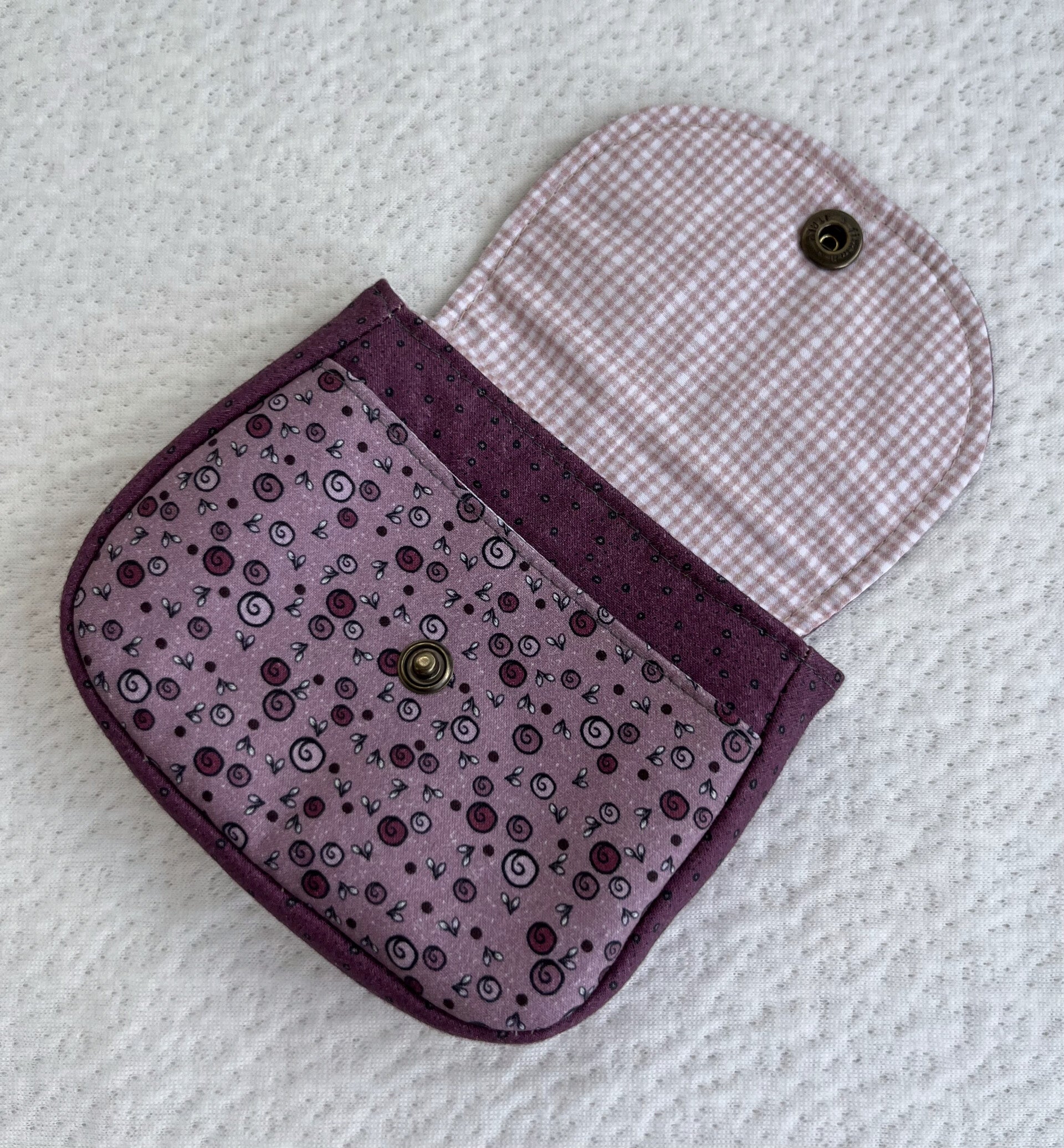 This small purse is perfect for carrying your everyday essentials. It has one main compartment and a handy front pocket to help keep your items organized. It closes securely with a snap button.